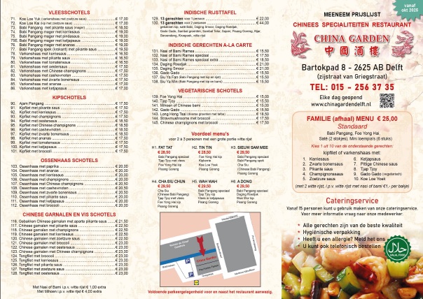 CHINA GARDEN DELFT!Wij zijn al sinds 1977 hèt adres in Delft en omstreken voor lekker Chinees eten. Al onze gerechten worden met uiterste zorg bereid met uitsluitend verse ingrediënten. U kunt in ons restaurant heerlijk genieten van de meest bijzondere Oosterse specialiteiten en uiteraard kunt u onze heerlijke gerechten meenemen voor thuis.Op deze website krijgt u een indruk wat u bij ons kunt verwachten. Tevens kunt u de afhaalmenukaart downloaden zodat u thuis op uw gemak een bestelling kunt doen.